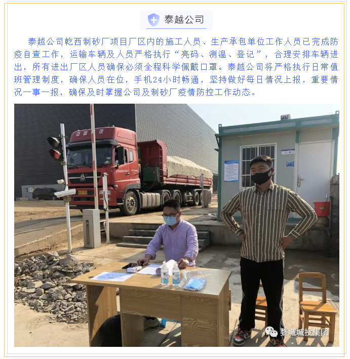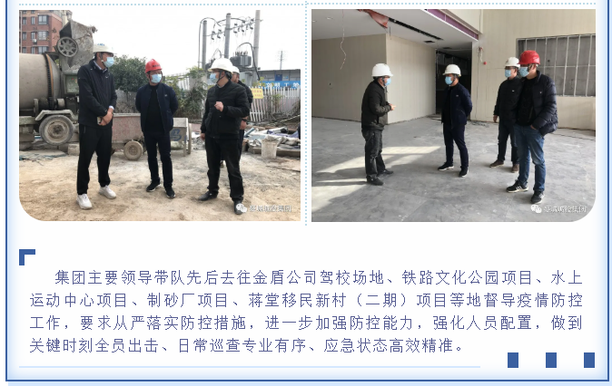 為貫徹落實(shí)省、市、區(qū)疫情防控工作視頻會(huì)議精神,婺城區(qū)城投集團(tuán)全員行動(dòng),在集團(tuán)疫情防控工作體系的框架下,分別以職能部門和子公司、項(xiàng)目為主體,制定切合實(shí)際、有操作性的疫情防控方案,同時(shí)組織紀(jì)檢專班力量,成立督查應(yīng)急小組,對(duì)各工地(項(xiàng)目)疫情防控措施設(shè)置情況進(jìn)行督查督辦,集團(tuán)上下全面緊起來(lái)、嚴(yán)起來(lái),疫情防控工作氛圍濃郁。